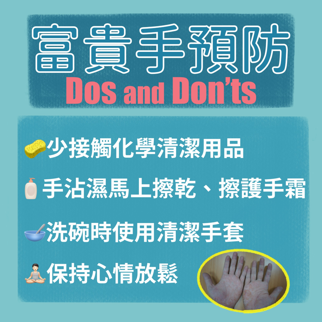 避免過度洗手或使用強烈清潔劑。 選擇溫和、無香料的清潔用品。清潔後立即擦乾,並使用滋潤度高的護手霜,特別是含有凡士林、甘油、尿素等成分的產品。戴手套時需注意手部乾燥。